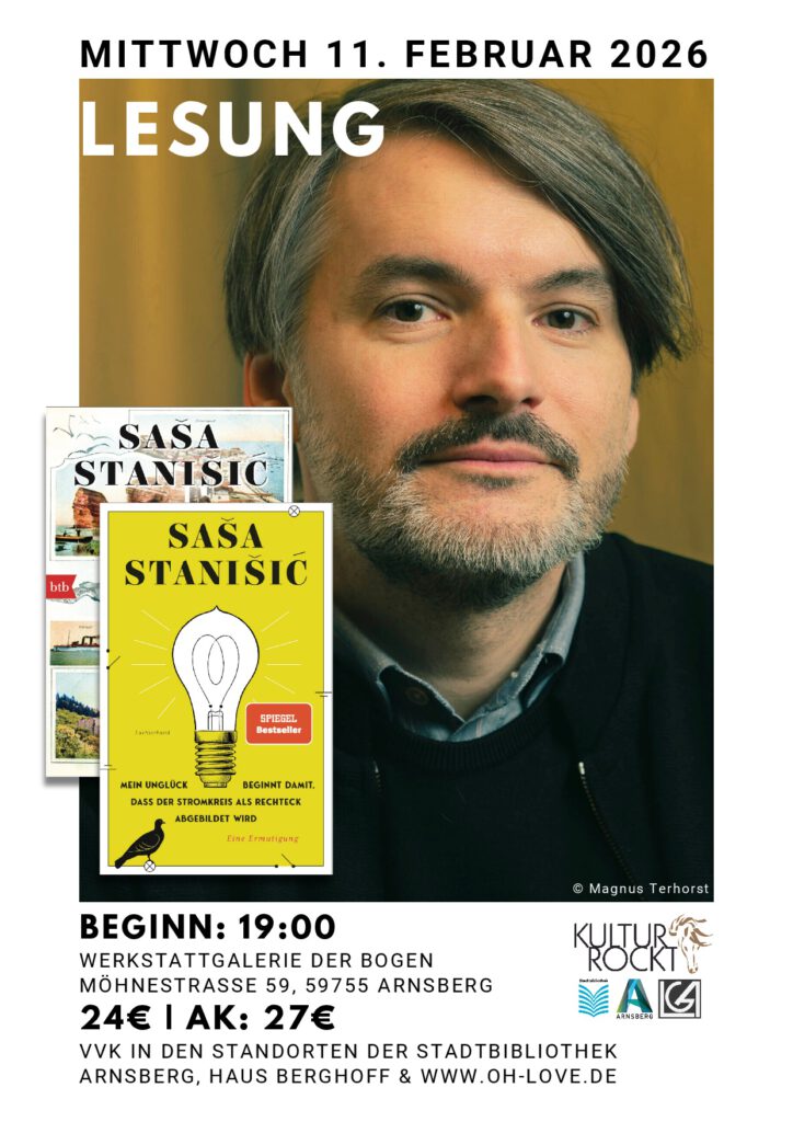 KULTUR ROCKT, das Kulturbüro Arnsberg und die Literarische Gesellschaft Arnsberg e.V. laden zur KULTUR-ROCKT-Winterveranstaltung am 11. Februar 2026 um 19.00 Uhr in die Werkstadtgalerie Der Bogen, Möhnestraße 59, 59755 Arnsberg-Neheim.